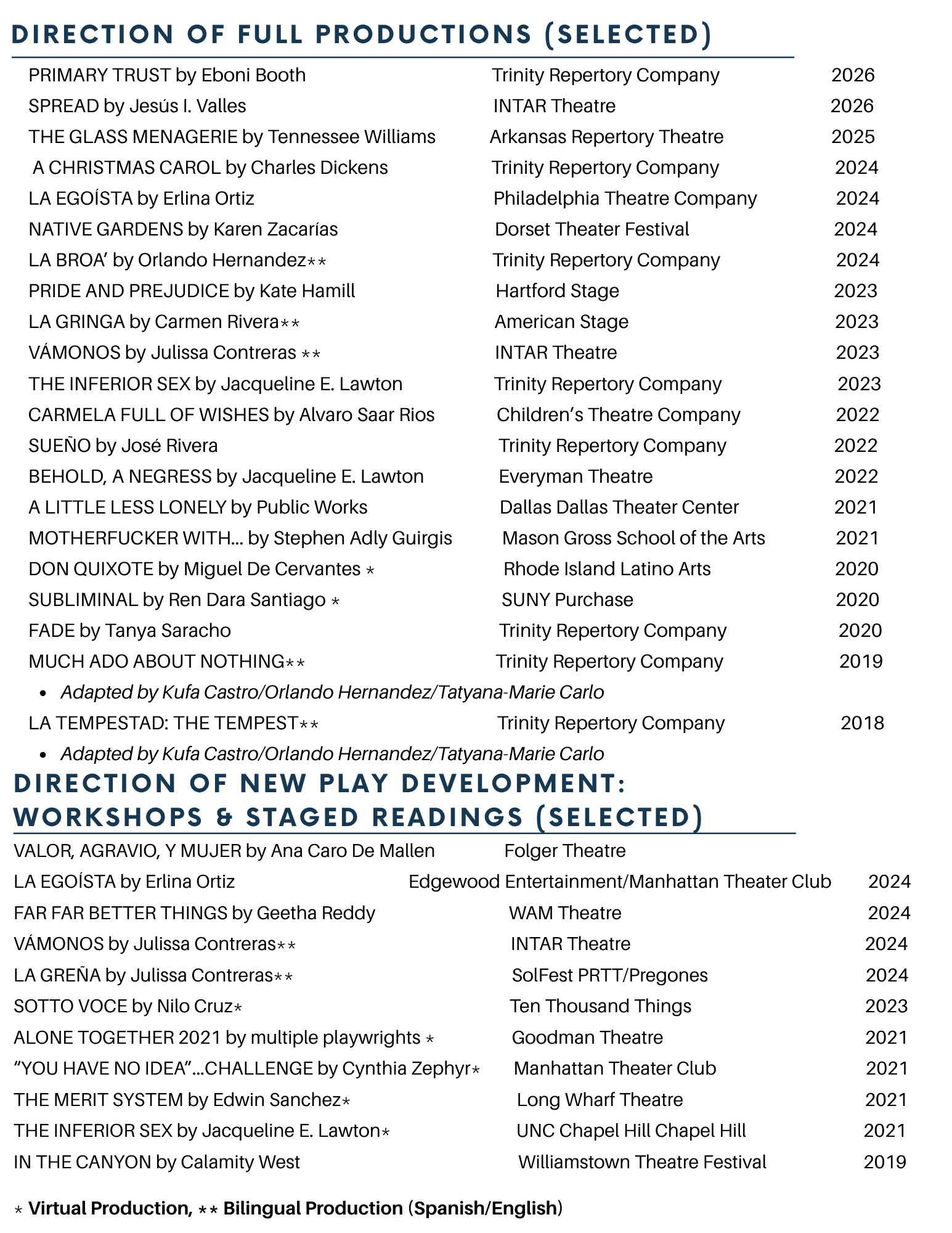 Tatyana-Marie Carlo (ella/she) is a Latiné director and producer, and the Resident Director of Trinity Repertory Company. Her work focuses on joyful bilingual theater making, creating experiences that hold the full range of human emotion. She is a founder of La Bulla Collective, a multidisciplinary theater collective that creates original work and multilingual adaptations of classic plays.